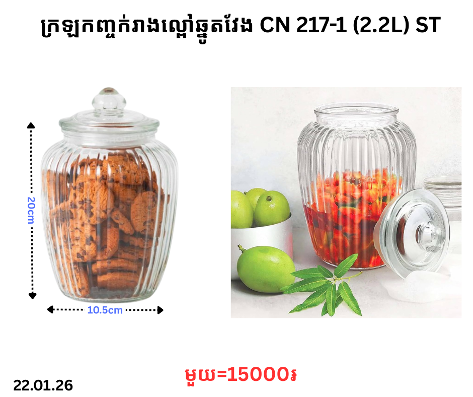 ក្រឡកញ្ចក់រាងល្ពៅឆ្នូតវែង CN 217-1 (2.2L) ST January 22, 2026 Posted in 15000, CN, ST, ក្រឡ, ក្រឡកញ្ចក់, ក្រឡកញ្ចក់រាងល្ពៅ, ក្រឡកញ្ចក់រាងល្ពៅឆ្នូតវែង, ក្រឡកញ្ចក់រាងល្ពៅឆ្នូតវែង CN, ទំនិញថ្មី Product Code : P0008923